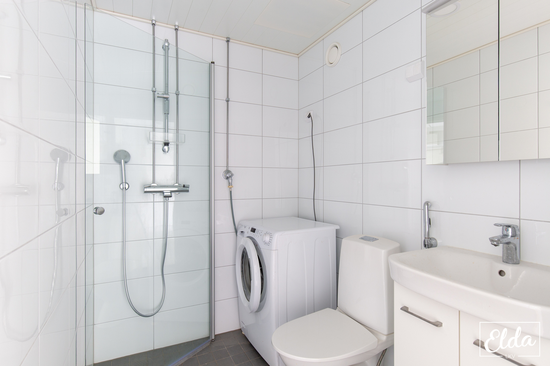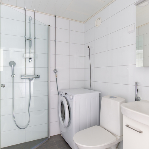 Varusteet: suihkuseinä, pesukone, pesukoneliitäntä, wc-istuin, suihku, peilikaappi, peili
