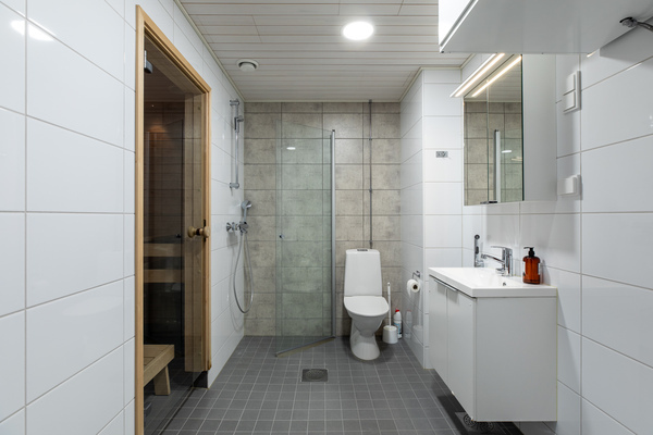 Varusteet: suihkuseinä, pesukoneliitäntä, lattialämmitys, wc-istuin, suihku, peilikaappi, kiinteät valaisimet